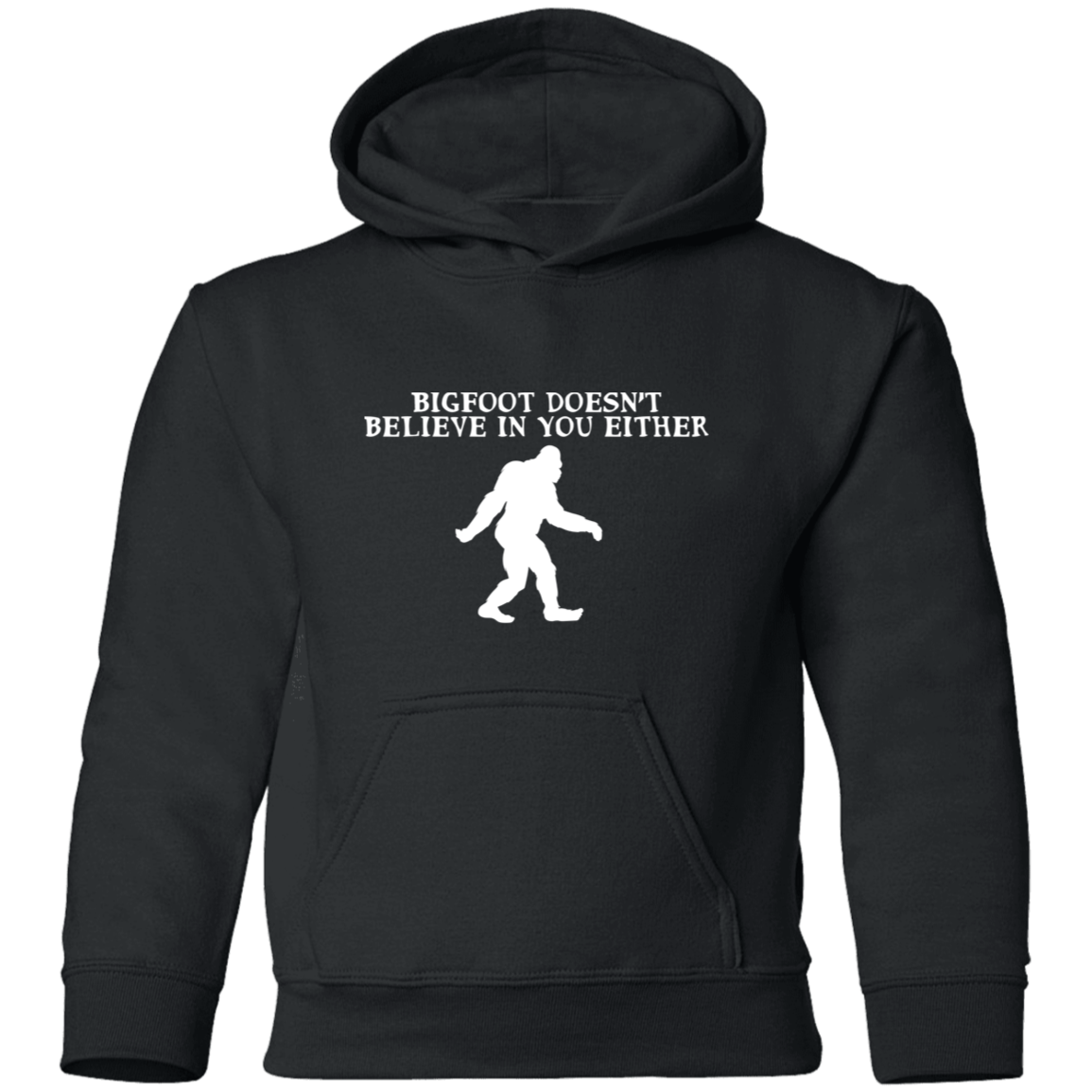 Get a little snarky with anyone that says that they don't believe in Bigfoot with this "Bigfoot doesn't believe in you either" kids pullover hoodie. Great gift for any kids that believe in Bigfoot.